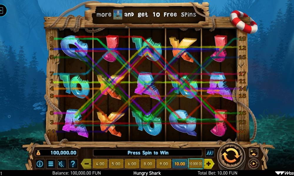 In the Hungry Shark online slot you are greeted by 5 reels and 3 rows of symbols, which creates a standard grid for the game. The slot has 20 winning lines on which combinations of identical symbols are formed. A winning combination counts when three or more of the same symbols fall on one of the lines from left to right.
