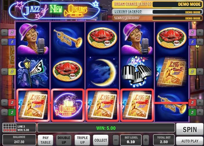 In the prize round of «Jazz of New Orleans» video slot you would have to choose a jazz club first and one of the instruments then. Here you can win up to twenty five free spins with extra Wilds, up to five of them. The casino stakes instead of the player here. Free spins can be prolonged up to two hundred rounds.