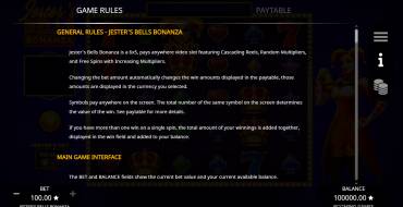In Jester's Bells Bonanza, the gambler wins if 8+ identical symbols appear on the field (not counting Scatter - it pays for 4+). There are 5 rows on the 6 reels. There are 11 symbols involved, of which 9 are simple and 2 are special. Each win triggers a cascade. The signs that gave a payout - are removed, new ones fall in their place. The cascade continues as long as the field continues to form new payouts.