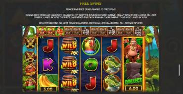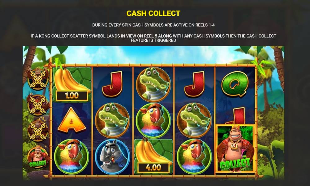 The simultaneous appearance of bananas and King Kong on the reels activates the Cash Collect feature and gives a cash payout to the player.