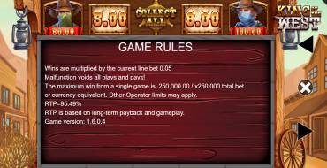 Five reels of three rows each is the playing field of the King of the West online slot. On it appear images associated with the cowboy theme (revolvers, whiskey, gold coins) and stylized card symbols. There are 4 older symbols and 5 younger ones. All of them give a payout for 3-5 pieces. Winning combinations are made from the first reel in a row. The payout lines are fixed at 20. The game provides freespins, instant cash prizes. The range of bets is 0.2-100 euros. The maximum win is x50000 of the bet.