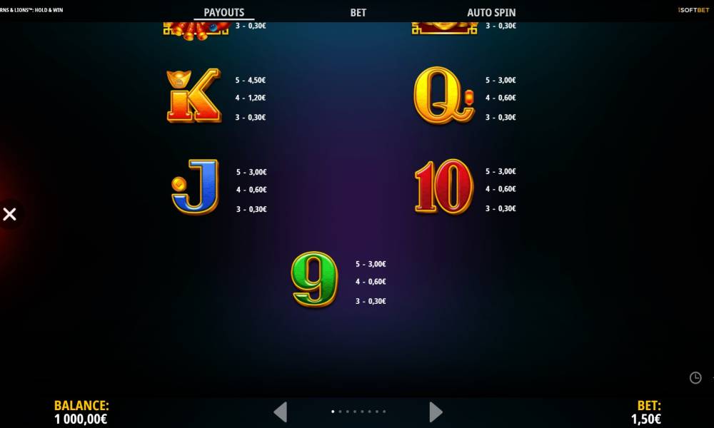 The Lanterns & Lions: Hold & Win slot machine from the iSoftBet provider has a 5x3 playing field. Payouts are made on 25 fixed lines.