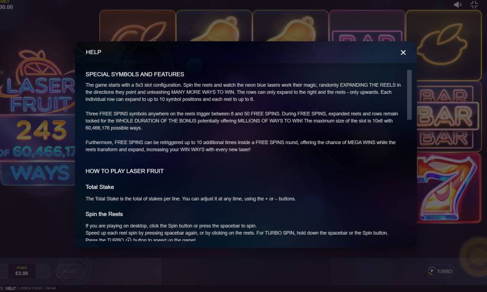 Payout amounts appear in the box below the reels. The payout table contains general information with an animated bonus demonstration. In the help, the characteristics of the model are described in more detail. Download the Laser Fruit is not necessary. The game opens in the browser without problems.