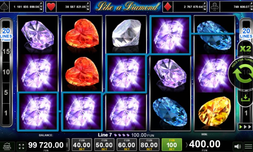 In the online slot Like a Diamonds, the playing field is 5x3 and the paylines are fixed at 20. Combinations are made from left to right from the first reel. Three higher and four lower symbols are paid from three pieces. The provider added two bonus rounds to the machine - Gamble and Jackpot Cards. Users can bet on the spin different amounts from 0.01 to 1000 euros. The maximum winnings are x1000 of the bet.