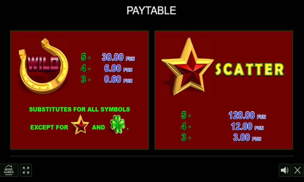 The Scatter symbol is a clover leaf, which can fall only on the 2nd and 4th reel. At the same time, it always occupies all neighboring positions around it. It works as a Wild symbol, paying at its value and making combinations with other images.