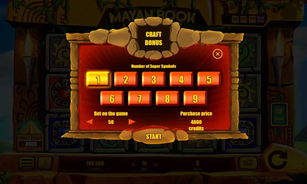 The playing field in the Mayan Book consists of the traditional 5 reels, each of which is 3 cells high. There are 10 paylines fixed, taking into account the symbols from left to right. The stake is chosen by the player, it can be from 0.1 to 20 euros, but casinos sometimes expand this range. In total, the game has 9 regular and 1 special symbol with paired functionality. The maximum winnings x10000 of the bet. Freespins bring bonuses in the form of super symbols. There are also risk games and buy-in bonus.