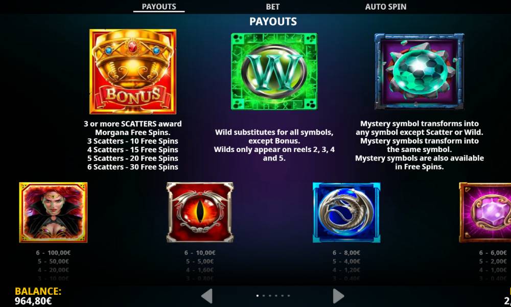 The Morgana Megaways online slot from iSoftBet offers a mystical look at the epic of King Arthur and a chance to work magic with the famous sorceress Morgana. The game uses the innovative Megaways design to create a huge number of paylines (up to 117,649), paytable and mystical symbols, free spins with multipliers and respins. Winnings can dazzle the imagination and reach a maximum of x10,000 to the bet.