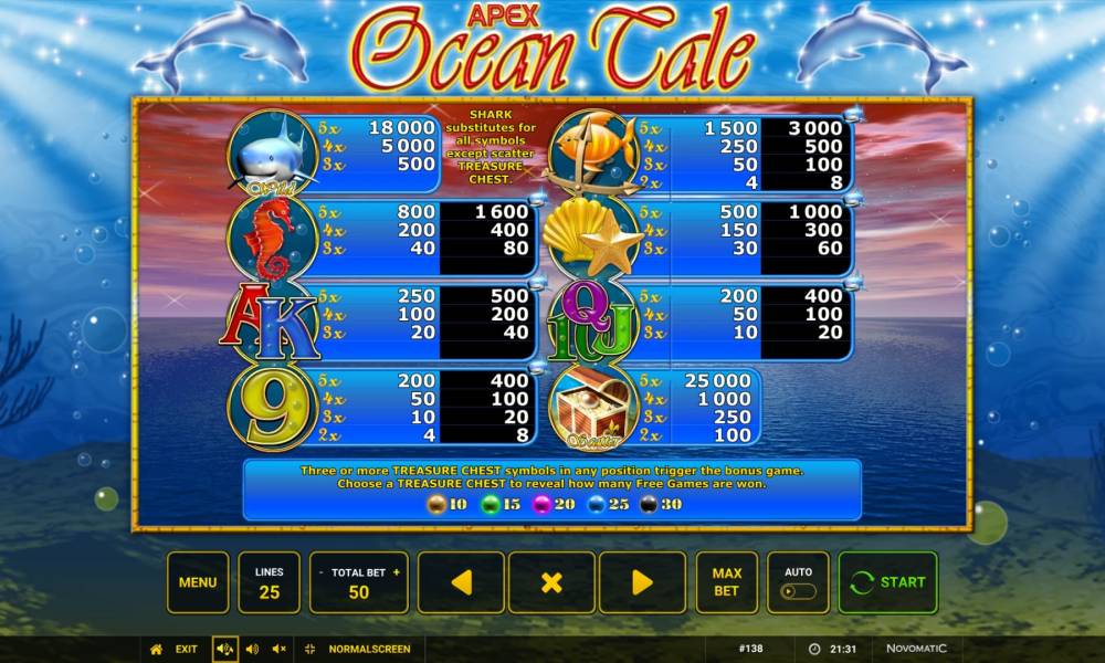 Crystal pure underwater worlds with colorful corals and fishes all the way you look – this is «Ocean Tale», the exciting video slot with five reels and twenty five lines. Even the shark is on your side!
