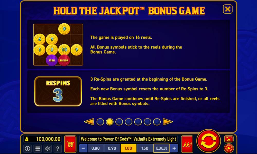 The Power of Gods: Valhalla Extremely Light 4 reel slot from Wazdan uses a 4x4 playing field, with the famous Pay Anywhere payout system. The betting range varies from 0.2 to 10,000 coins. This means that winning combinations can be formed when 8 to 16 identical symbols fall on the screen in any position. An important element is the bonuses: when 6 or more bonus symbols fall out, the Hold the Jackpot feature is triggered, where you can win up to 2145x your bet.