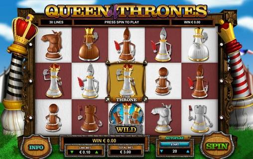 Queen of Thrones is a five reels video slot with thirty payment lines. All the lines are active on default and you can’t change its quantity. The bet per line can be made in range from one to ten cents. Consequently, you can play this slot machine, betting up to three euro per spin (by example of Netbet Casino).
