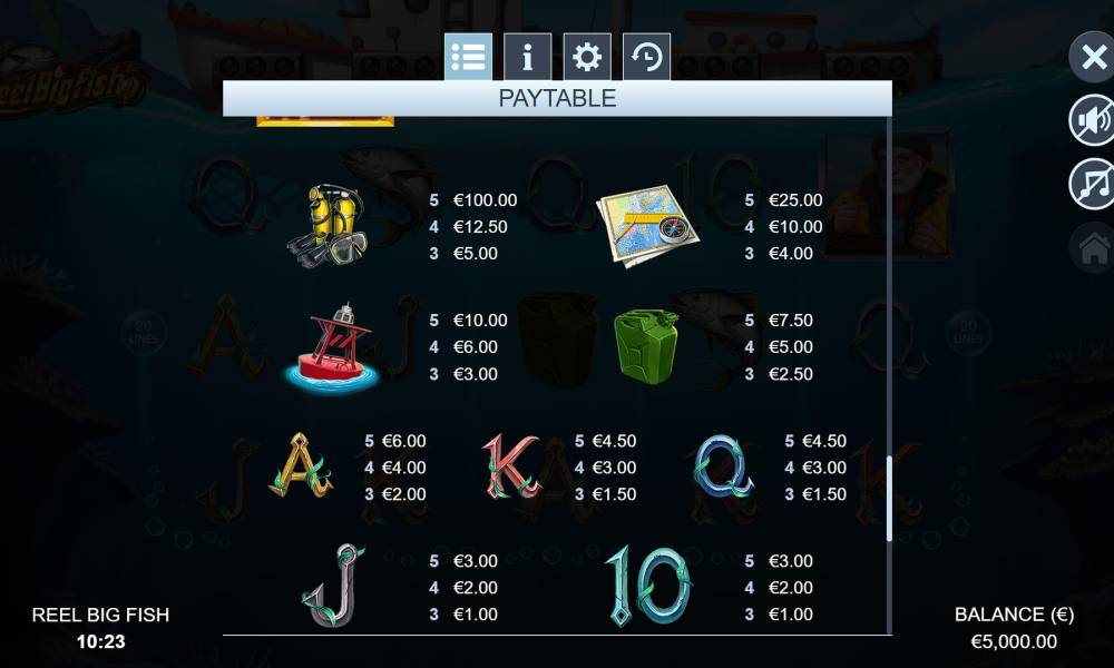 There are 5 reels of three rows on a background of blue sea under a large ship. Card symbols appear on them (these are the 5 cheap symbols), as well as an aqualung, a map, a buoy and a canister (4 expensive kinds). These symbols are stacked in combinations of 3 to 5 pieces. They are counted when they are located from left to right, starting from the first reel on fixed paylines (20 in total). The size of the prize depends on the bet game, and put on one spin can be from 0.2 to 200 euros. The maximum payout in the online slot is x5252. The provider added two special symbols, a round of free spins and an additional bonus with the capture of money fish. If you do not want to wait for the fallout of Scatter symbols, you can activate free spins by simply buying them in the right amount.