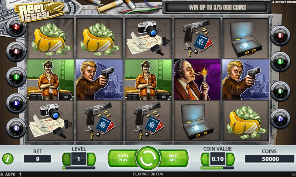 Reel Steal slot has 9 lines, they are fixed, meaning the player can only change the value of the coins.