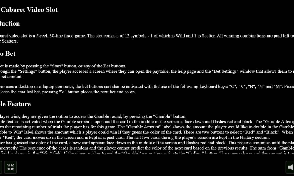 The format of the playing field of the Retro Cabaret online slot is 5x3, paylines are fixed 30, mechanics - payment from left to right from the first reel in a row. The game has 4 low, 4 medium and 2 expensive types of symbols. Symbols from the first two categories pay for 3-5 pieces, and from the third - for 2-5. Two special symbols are also present. The provider has added a bonus feature, free spins, jackpots and a risk game. You can bet on a spin in the range of 0.01-1000 euros, and the maximum winnings are x1000.