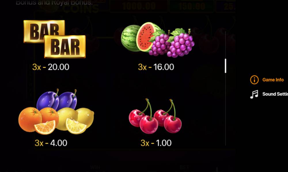 Royal Bonus is the crowned coin. It falls only on reel 2 and collects the values of all Bonus symbols on the screen.
