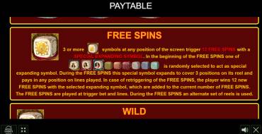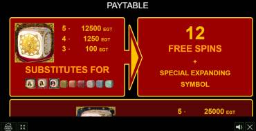 The user will get 12 free spins for 3 or more Wild symbols on the field. In this case, one of the regular symbols will be immediately selected as a special one. Each time it will expand on the whole reel and will be paid. If three or more more Wild symbols fall on the field, 12 more will be added to the remaining spins.
