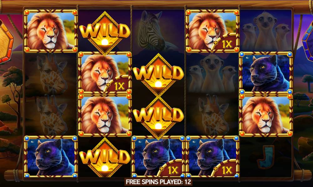 Lion Feature and Panther Feature. There is 1 counter each to the left and right of the field. Every 12 spins they change. For the first 12 spins after the start, all lion signs are recorded in the left counter. Then for the next 12 spins all panther signs are recorded in the right counter. This alternation continues continuously. When the next 12 spins end, all the accumulated symbols in this counter are thrown to random cells, replacing the current symbols. If on the same cell caught a lion and a panther - they will turn into Wild. If 2 lions landed - they will give +x1 additional multiplier if this sign gives a payout. And the combination of lion and Wild will give Wild with +x1.