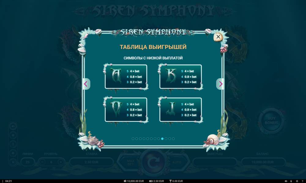 The Siren Symphony slot machine from the Microgaming provider has a standard playing field, consisting of 5 reels with 3 symbols. Payouts are made on 25 pay combinations.