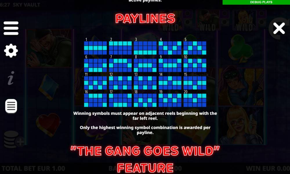 The Sky Vault slot machine from the Leander Games provider has a 5x3 grid with20 pay lines.