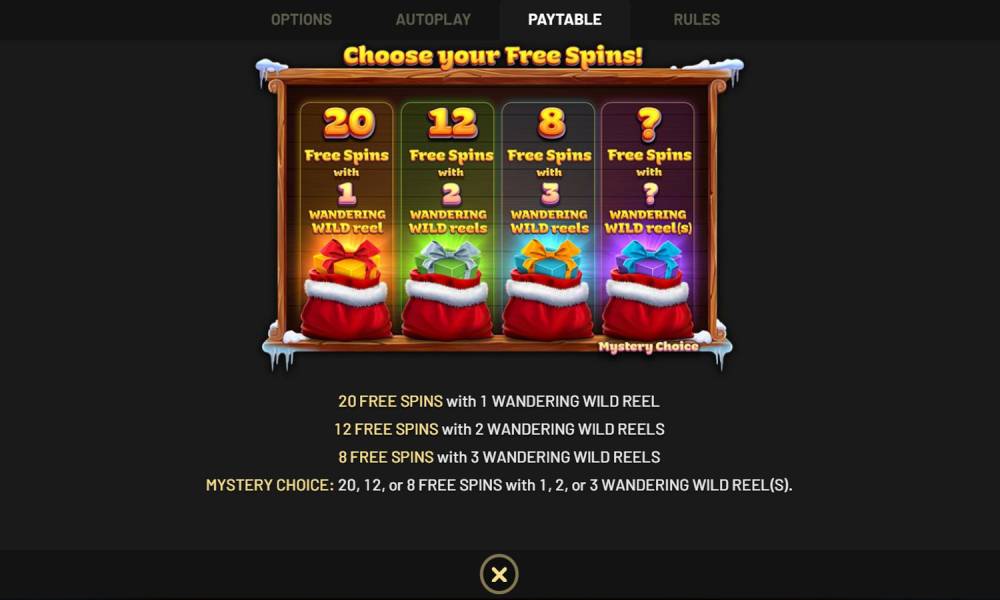 Free spins in the Sleighin' It slot are activated when three Scatter symbols appear on the reels. The Pick Bonus round begins. The player is offered to choose one of four options: