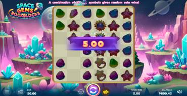 The Space Gems. Rockblocks is a slot with a large 6x6 field and with no line payouts. It pays 5+ identical symbols if they appear next to each other, touching at least one side (except for the corners, neighboring diagonally doesn't count). There is also an Astronaut symbol that pays on any cells. After any win, a cascade is triggered and the paid symbols disappear from the field.