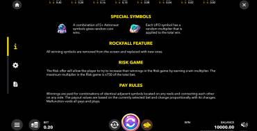 Rockfall Feature. All symbols (including Astronaut) that gave a payout are removed from the field. New ones fall in their place. The UFO symbol is also removed from the field after it activates an additional multiplier. This happens even if there is no winning combination on the field, in which case only the UFO is removed.