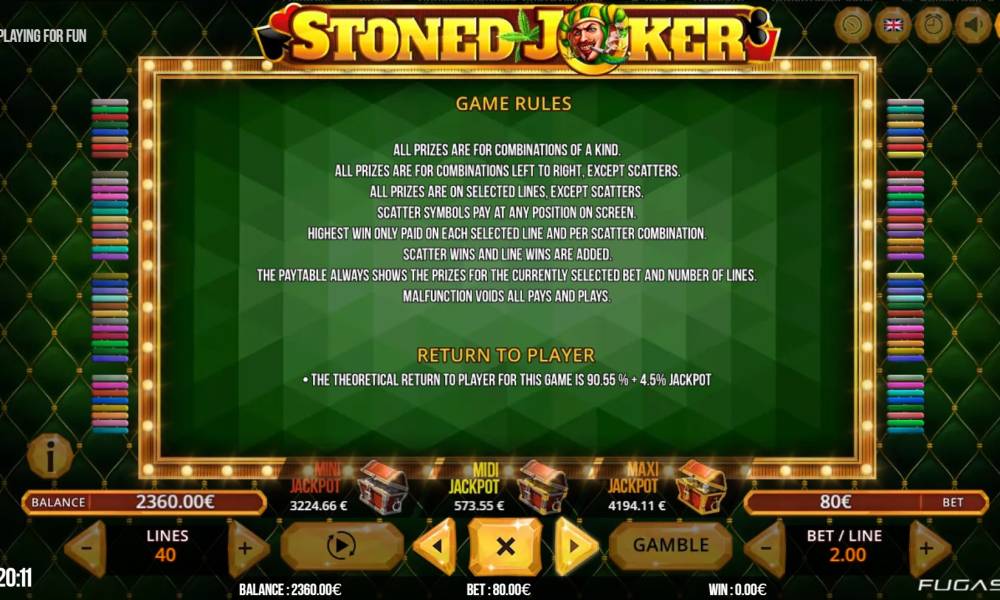 Because Stoned Joker slot machine has no bonus feature and has an average volatility and win rate of 20%, and most importantly that there is no strategy to guarantee a stable profit from playing slots, we advise you to take these parameters into account when choosing your bet.