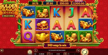 Super Golden Dragon Inferno - Hold&Win is a bright five-reel slot with fixed line payout mechanics (243 pieces). The playing field has a format of 5x3. Payment is made for 2 or more identical symbols, starting from the first reel. The game uses 4 kinds of junior and senior symbols each. There are special symbols that activate bonus features, Hold&Win Bonus round, buy respins. Players can bet on a spin from €0.25 to €125. The maximum win is x2916 of the bet amount.