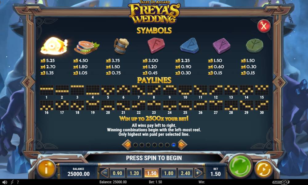 The Tales of Asgard Freya’s Wedding slot machine from the Play’n Go provider has a standard 5x4 playing field. All payouts are made on 30 pay lines.