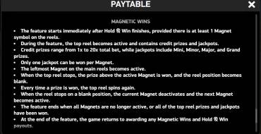 Magnetic Win. Immediately after the Hold And Win Feature ends, this round is triggered if there is at least 1 Magnet sign on the field. The extra row above the field is released, the whole process takes place only on it. The gambler has as many attempts as there are Magnet symbols on the main field. The essence of the round: the extra row rotates, it has Coin symbols and symbols with 4 jackpots. The gambler needs to stop the rotation. The symbol on which the rotation stops - pays, after which his cell is empty, but continues to participate in the game. Then the rotation starts again, and the gambler again needs to stop it. The game continues until the spin stops on an already empty cell. If there are 2+ Magnet symbols on the field - the game can be continued, but the empty cells are not filled again.