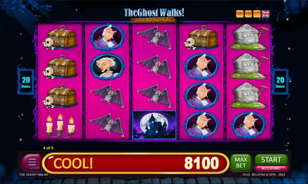 The playing field in The Ghost Walks uses 5 reels with a height of 4 cells. There are 20 fixed lines for making combinations. The payout table doesn't impress with multiplier coefficients, but symbols become in a row very often thanks to the Wild bonus symbol. There are 3 special symbols and 10 row symbols in the game. The bet range is from 0.2 to 20 euros. The size of the maximum win is limited to x4000 of the bet of the current round. Free spins are activated in the standard way, when 3 Scatter symbols fall out.
