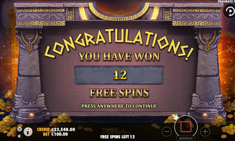 To trigger the free spins round, at least three Scatter symbols in the form of Midas' golden hand must fall anywhere on the reels. After that, the playing field is completely cleared and miniature slots with miniature reels appear, which will spin and, depending on the result, a few more free spins will be added to the total. Their final number depends on the number of scatter symbols that triggered the game feature: