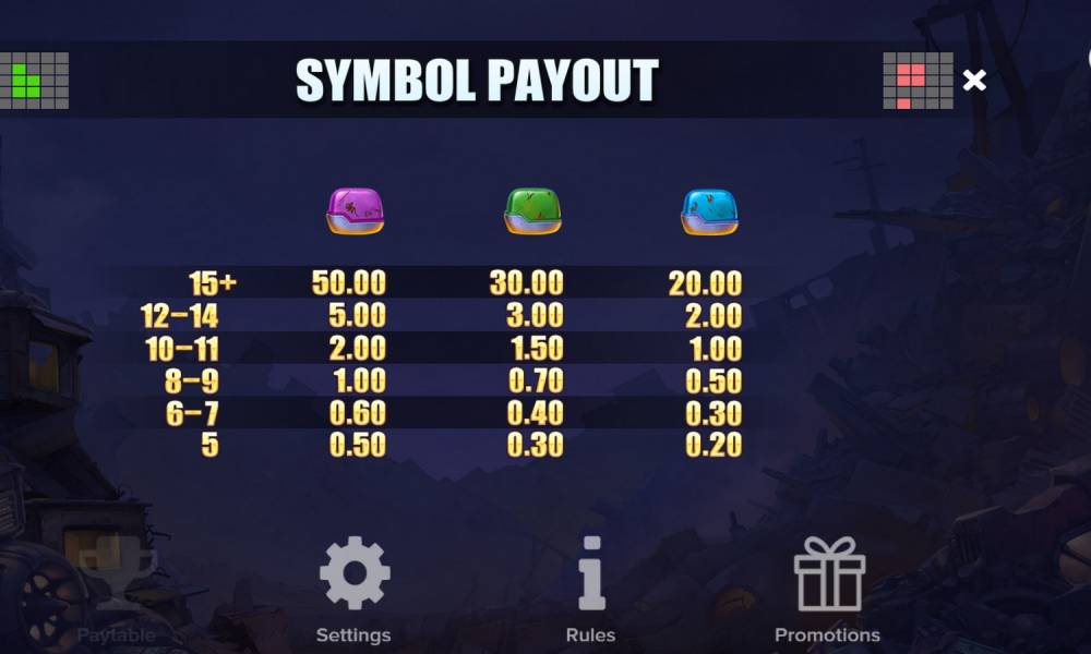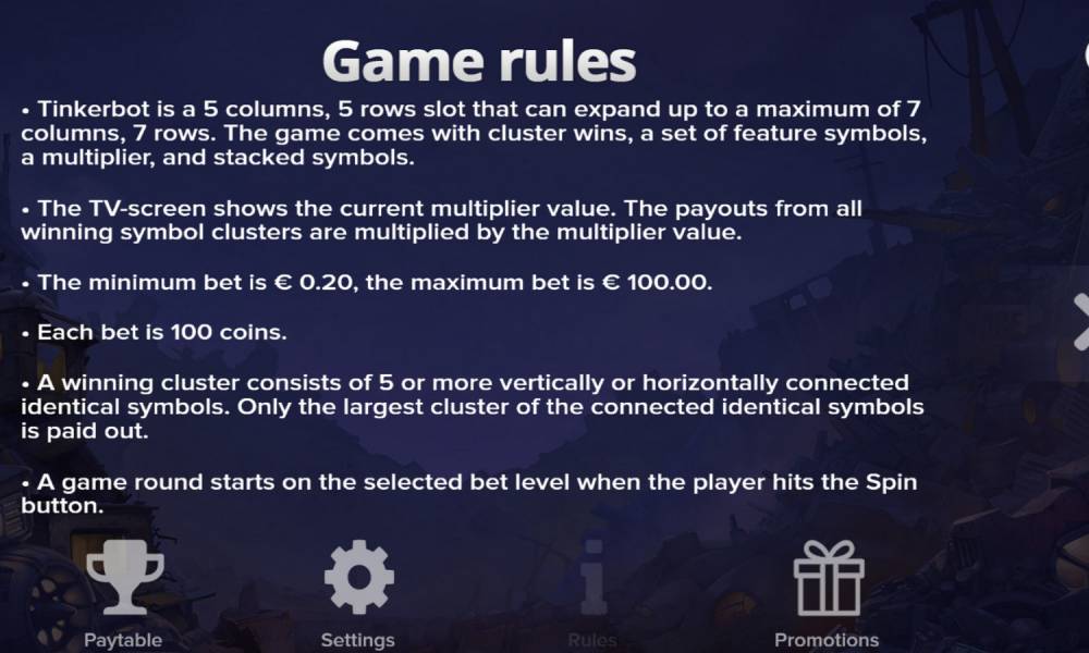 The Tinkerbot slot features 5 reels and 5 rows of symbols, offering an interesting cluster payout system. Instead of traditional lines, wins are formed when 5 or more of the same symbols touching horizontally or vertically. The game utilizes 3 lower and 4 higher types of symbols representing technical devices or their parts. The betting range varies from 0.2 to 100 euros, which makes the game accessible to users with different budgets. The developer has equipped the online slot with purchase bonus, freespins, multipliers and exciting bonus features. The maximum winnings are x10000 of the bet.