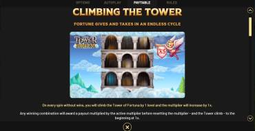 Climbing the Tower. If the spin did not bring a win the player climbs one floor in the tower. The multiplier, which is initially equal to x1, increases by one each time. As soon as a paying combination falls on the field, the winnings are multiplied by the achieved Multiplier. The multiplier then returns to x1.