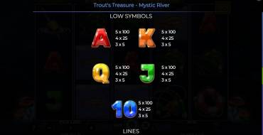 The reel field in the Trout's Treasure - Mystic River is 5x3, with a fixed 10 lines. In the spins, 3 special and 9 standard symbols are played. Normal mode is very boring, as all bonuses are realized in free spins. You can win up to x2000 from a bet from the range of 0.1 to 100 euros. Combinations are made from those identical symbols in a row from the leftmost reel to the right. Quite a typical set of rules, without any unique solutions. Slot that and pleases, that is very easy to master.