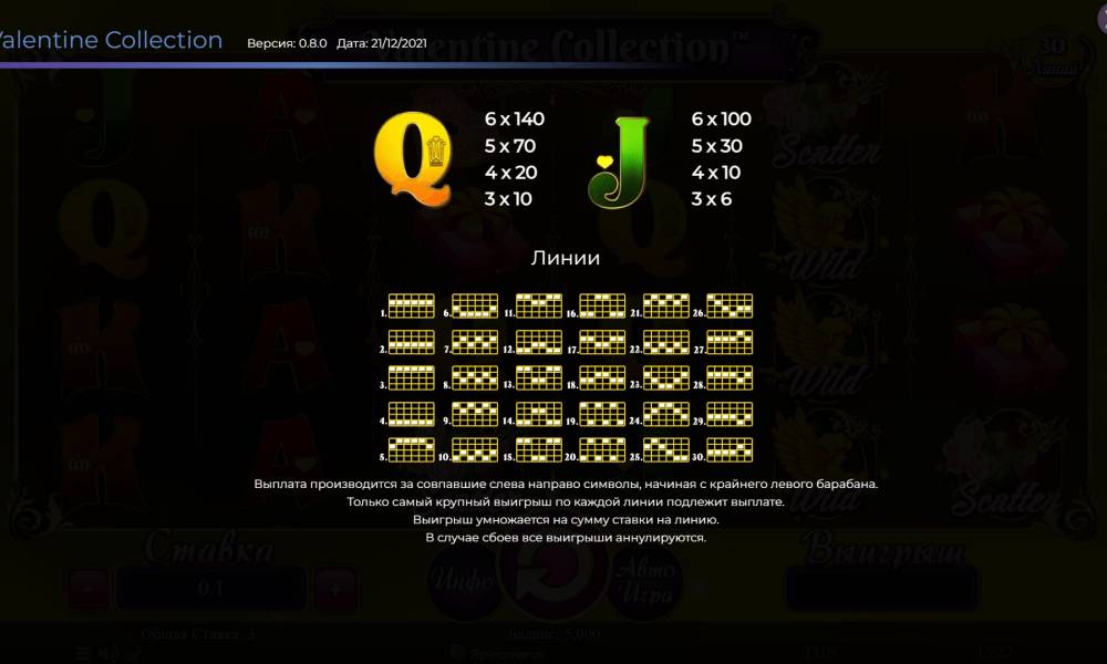 When you study the features of the slot and its functionality, you can start paying for real money and enjoy real winnings. The Valentine Collection 30 Lines slot machine is in different online casinos in the list below. All of them have licenses and guarantee an honest game. Before playing, look at the paytable, where there is a lot of information about the combination’s win.