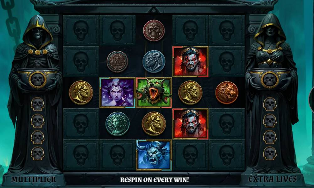 Multiplier and Extra Lives. To the left and right of the field are figures with counters - 5 empty skull cells (4 in a row and 1 separately in the bowl the figure is holding). Once all 12 BoltLock Blocker symbols are filled with game pieces, all the next winning combinations will replenish these counters. The counter on the left accumulates an additional multiplier. It is increased by blue flying skulls. The multiplier increases by +x1 each time the counter is filled. The counter on the right accumulates additional lives. It is increased by red flying skulls. Each life gives an extra respin if the spin ends without a winning combination - this way you can continue the series and keep the accumulated extra multipliers.