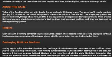Finding honest casino to play the Valley of the Dead OnlyWins is easiest in our top. We add sites only after a careful check, screening out projects with a dubious reputation. So the gambler can play slots from Yggdrasil Gaming in a good casino, and will not risk his deposit and personal information.