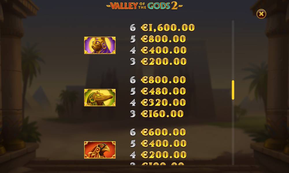 When you open the Valley of the Gods 2 slot machine, you will find yourself in the world of Egyptian legends. Ancient deities in animal incarnations appear on the reels. The background is blurred, but majestic columns, huge structures, slender palm trees, and colossal pyramids can be seen.