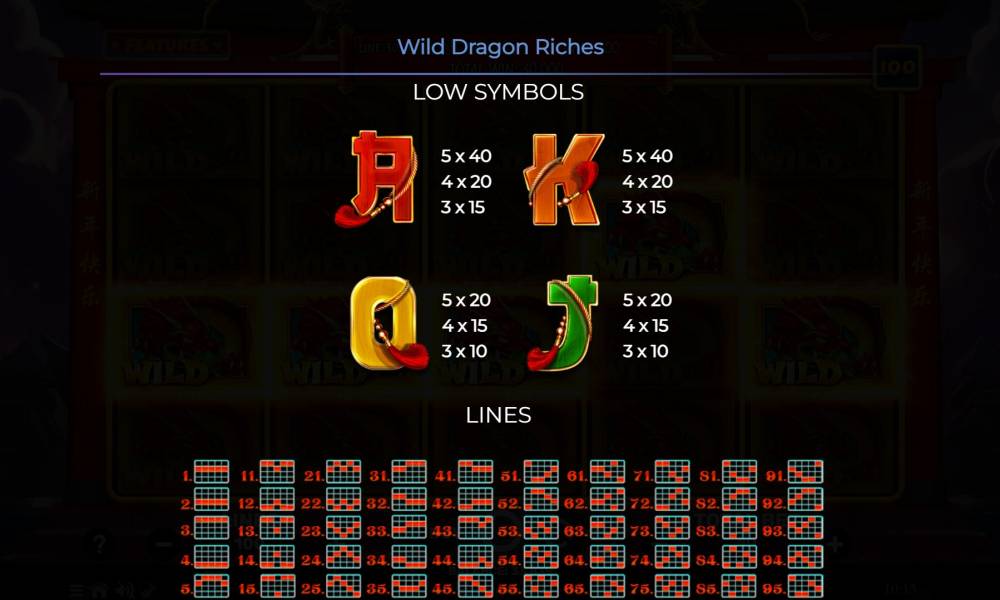 The Wild Dragon Riches is a slot with a 5x4 playing field. The player can choose the number of active paylines, starting from 10 and up to 100. There are 8 regular and 2 special symbols in the slot. Winning combinations are formed from left to right from 3 or more identical symbols in a row. Wild symbol helps in creating combinations, replacing other elements. Freespins are accompanied by bonus mechanics: in each of their rounds appears at least 1 Stacked Wild, which significantly increases the chances of winning. The bet varies from 0.1 to 1000 euros per spin. Beginning players should take into account that increasing the number of paylines automatically increases the bet amount.