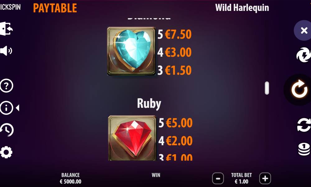 The Wild Harlequin slot machine from the Quickspin provider has a standard 5x3 playing field. Payouts are made on 10 lines.