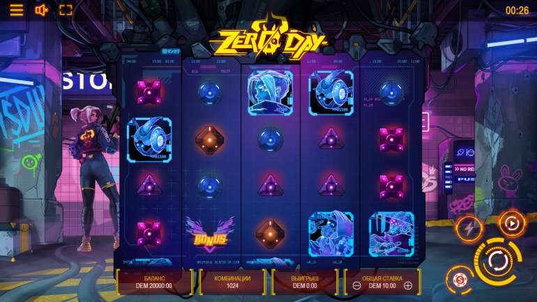 The Zero Day slot machine from the Mancala provider has a standard 5x4 playing field. Payouts are made on 1024 lines.