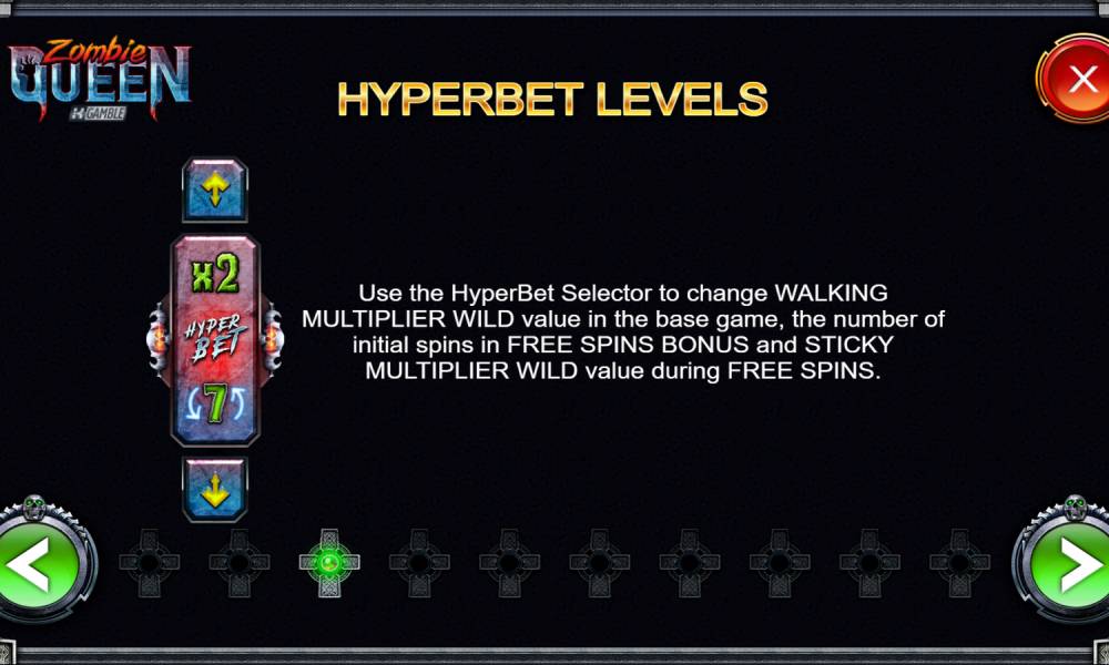 HyperBet. The gambler can choose from 4 game modes with different conditions. Different will be the minimum bet, the number of FS in the package, and the size of Multiplier Wild. In the first level - 0.12, 5 FS and Multiplier Wild x1. In the second level - 0.30, 7 FS and Multiplier Wild x2. In the third - 0.52, 8 FS and Multiplier Wild x3. And in the fourth, 1.00, 9 FS and Multiplier Wild x5.